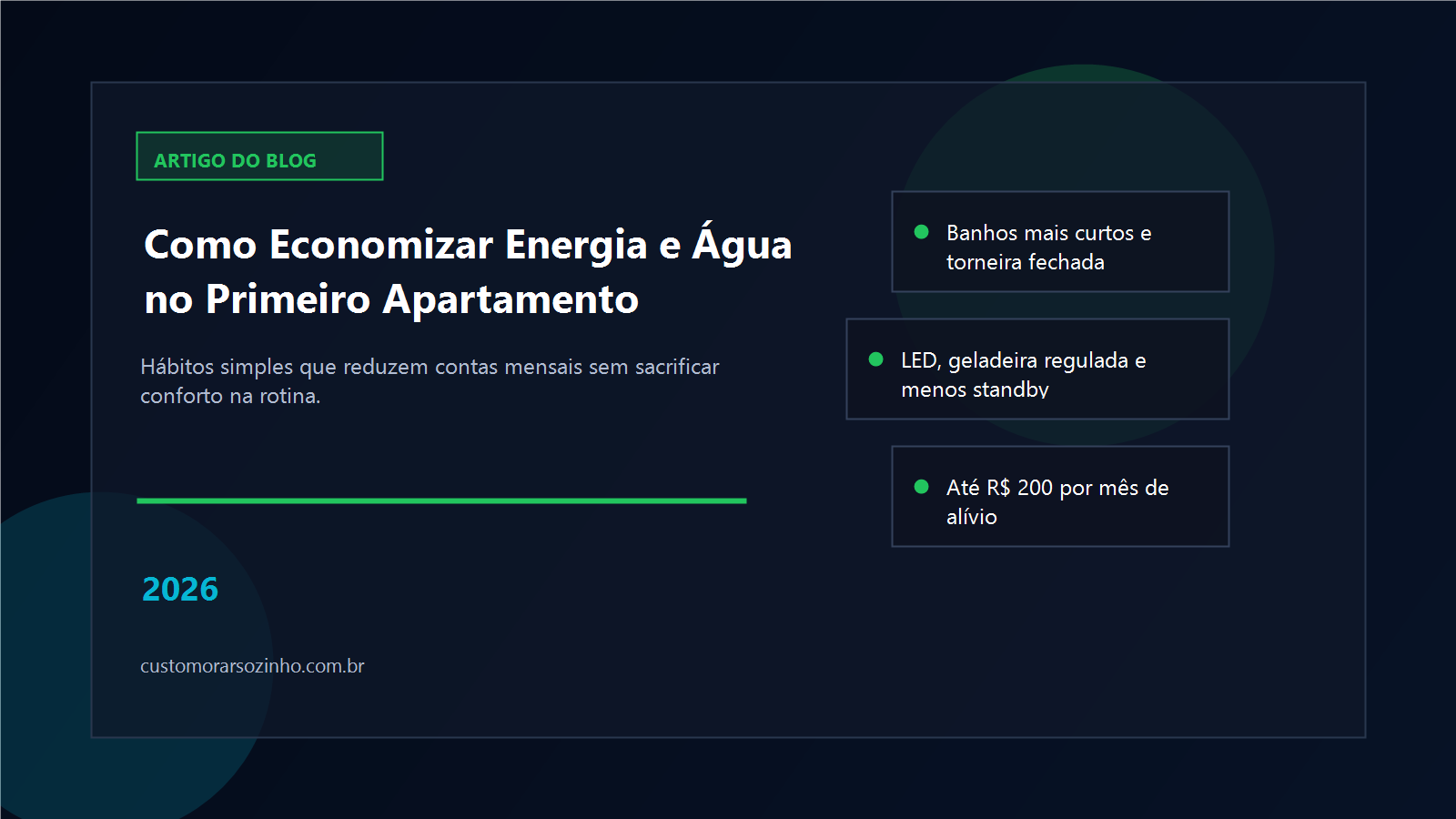 Comece pequeno: foque em 2-3 hábitos por semana. Em um mês você já vai ver a diferença nas contas. Lembre-se: morar sozinho é sobre sustentabilidade financeira, não sacrifício.
