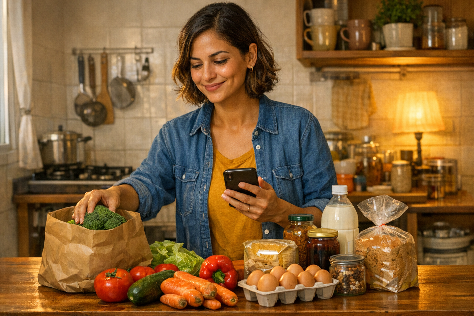 Cozinha em casa, compra com lista, pouco desperdício e delivery raro.